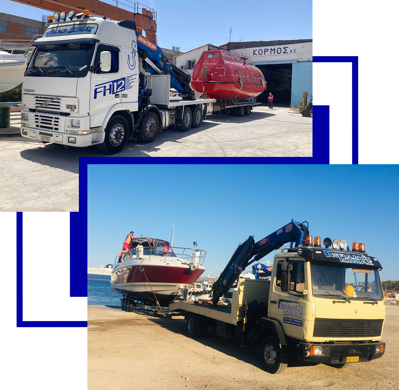 Διαθέτουμε ειδικά σχεδιασμένα φορτηγά και ρυμουλκούμενα, εξοπλισμένα με βάσεις που έχουν σχεδιαστεί ειδικά για να υποστηρίζουν το κύτος του σκάφους, γεγονός που ελαχιστοποιεί την καταπόνησή του.