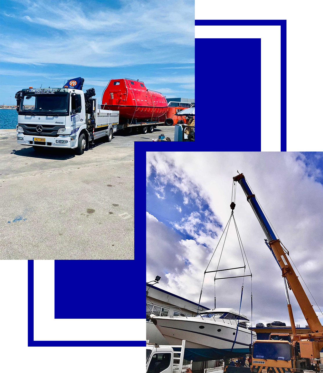 Καλύπτουμε την ανέλκυση - καθέλκυση και τη μεταφορά, ανεξαρτήτου μεγέθους και οποιασδήποτε κατηγορίας, λ.χ. γιοτ, μηχανοκινήτων, ιστιοπλοϊκών, καταραμάν κ.λπ.